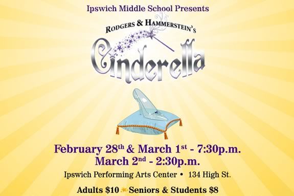 Ipswich Middle School presents Rodgers and Hammerstein's 'Cinderella'! Come see this adaptation of the classic fairy tale, and enjoy an evening of fun and music! Everyone knows a version of the story, but now Rodgers + Hammerstein’s Cinderella rehashes this classic with a makeover by book writer Douglas Carter Beane (Sister Act, Xanadu) with the same classic elements and some surprising new twists! Recommended for the whole family, Rodgers + Hammerstein’s Cinderella is a timeless tale where dreams really do come true.