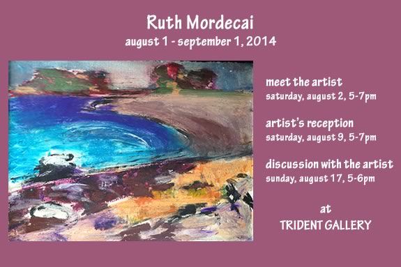 Trident Gallery is pleased to present an exhibition of new paintings, collages, and monotypes on paper by Ruth Mordecai. The gallery will host a public reception for the artist on Saturday, August 9, 5–7pm. The artist will be at Trident Gallery for conversation Saturday, August 2, 5–7pm, and will lead a discussion of her work on Sunday, August 17, 5–6pm.